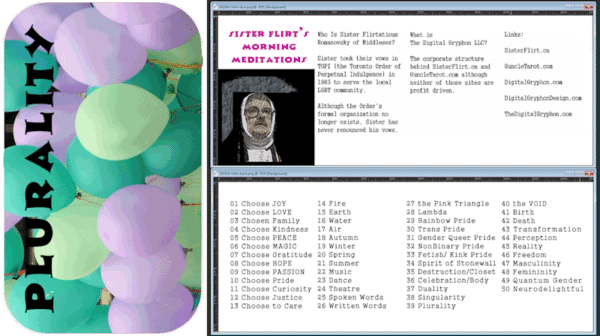 2025 Revised and Expanded version is here! This deck started as a set of 32 meditation/prayer prompt cards, 1.75″x2.5″ in a portable custom metal altar. It now includes 50 meditation/ journaling prompts in a redesigned package. This version includes three cards based on the vows I took in 1983 as a fully-professed member of the Toronto Order of Perpetual Indulgence.