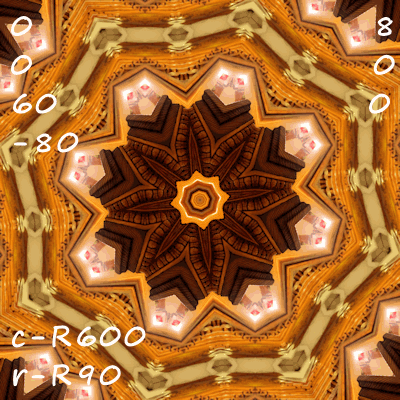 I don’t normally record the various settings on the Kaleidoscope function, as I don’t want to feel limited. Each image below (also reduced to avoid extensive download time) has those details recorded for this page. Each cropped image was run through the K function at 2 different settings, giving a hint at the full range of options that could be investigated.